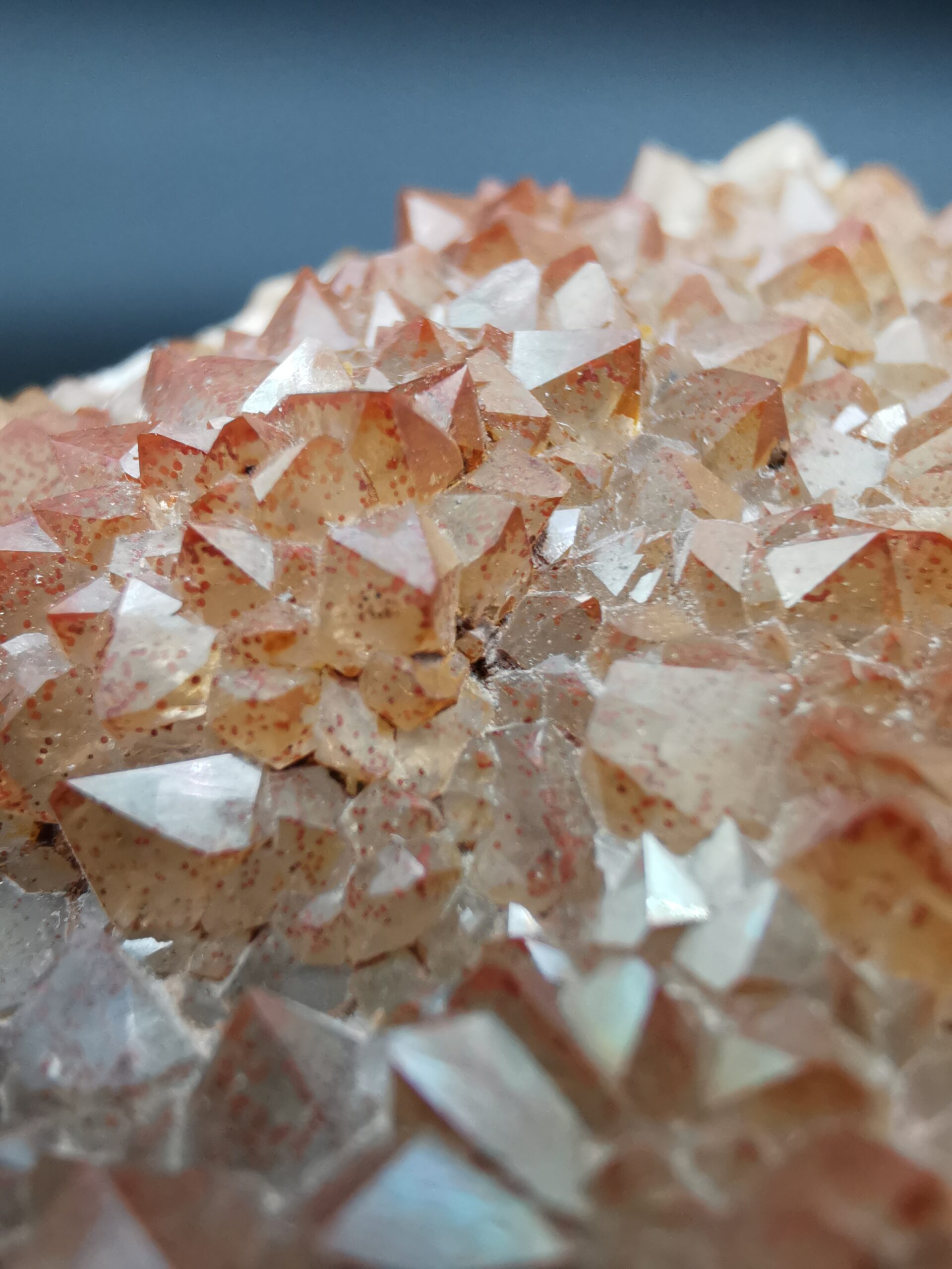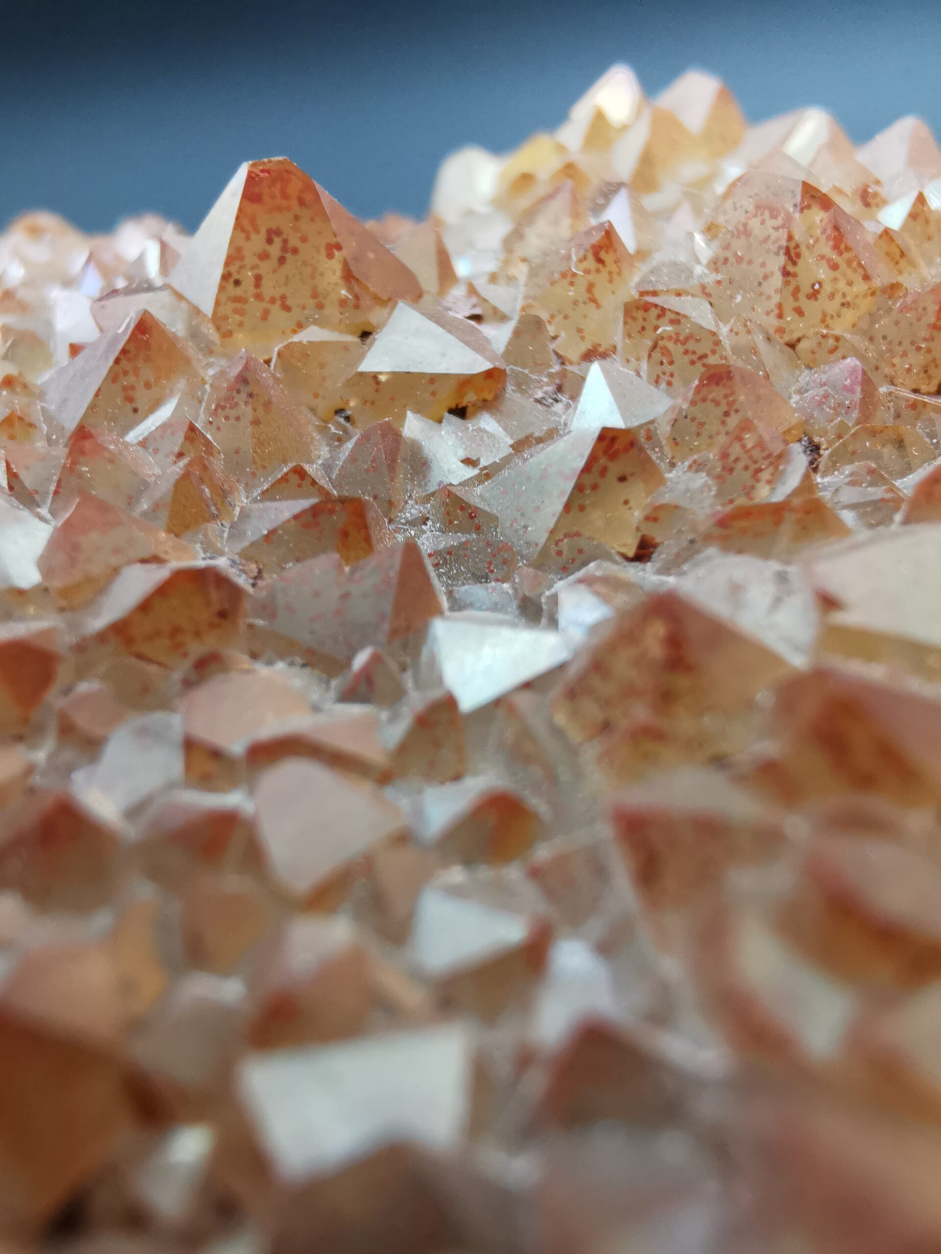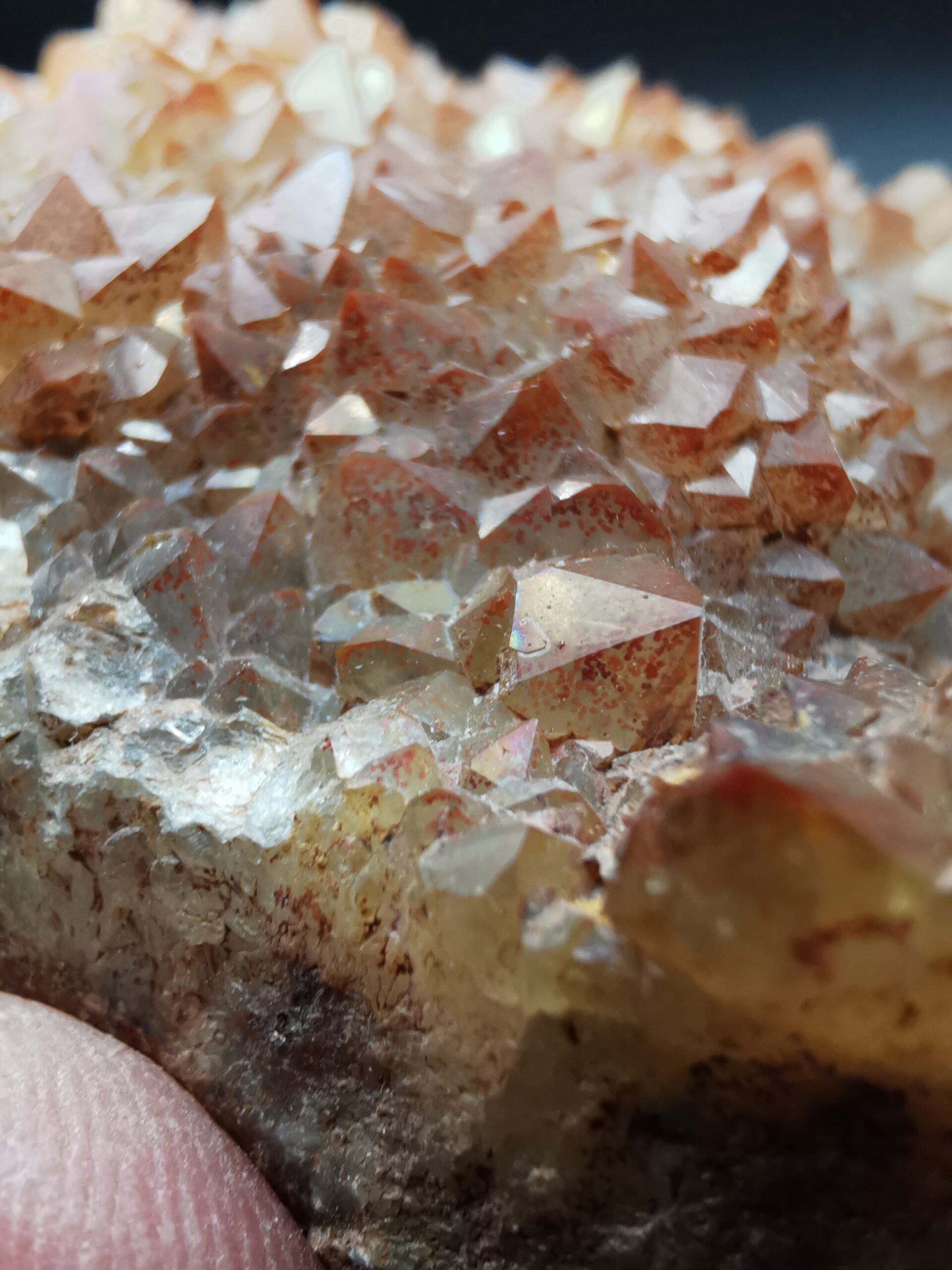 Many of the yellow specimens also have a colorful iridescence caused by a very thin layer of iron oxide on the surface of the crystals.