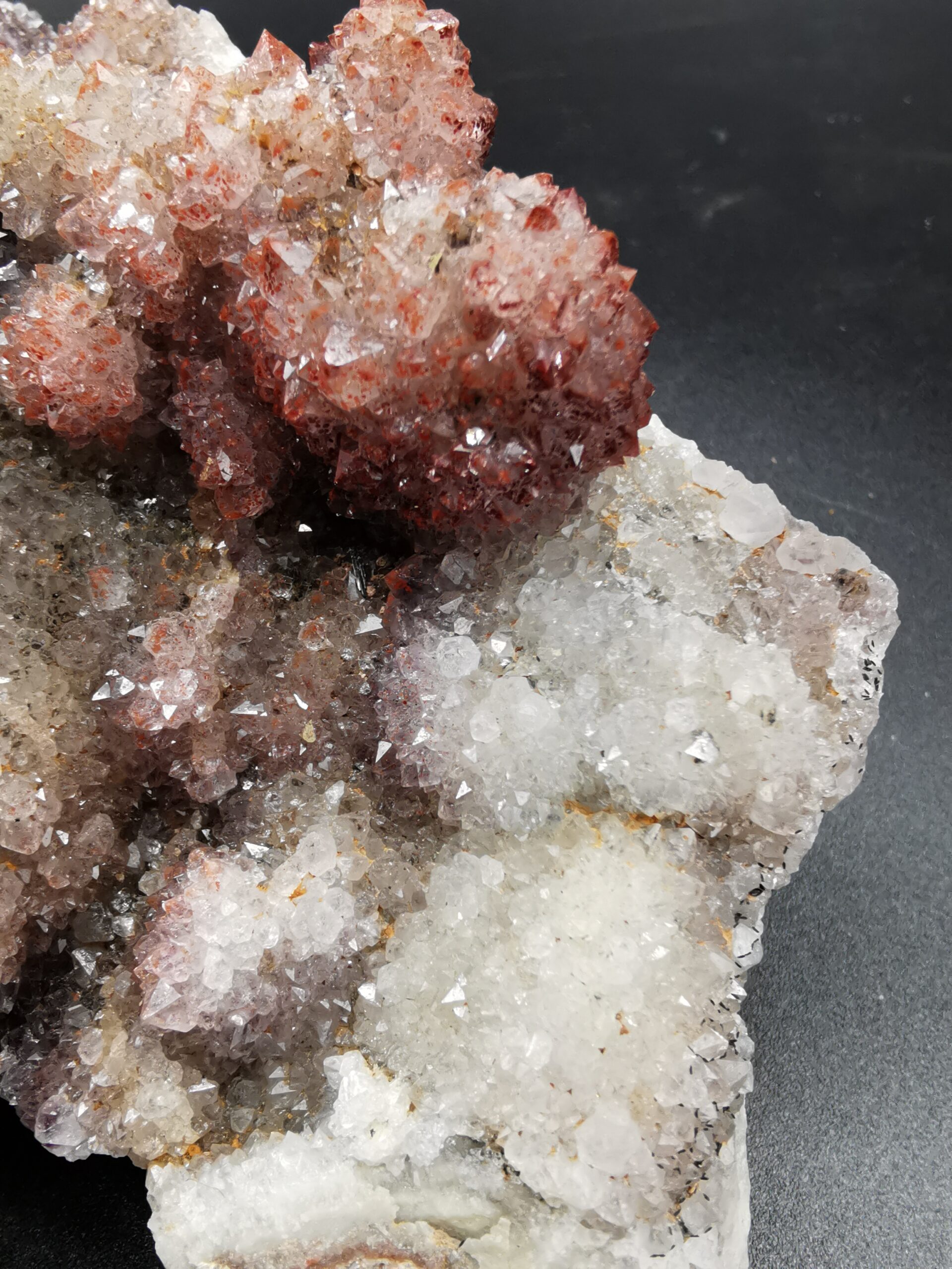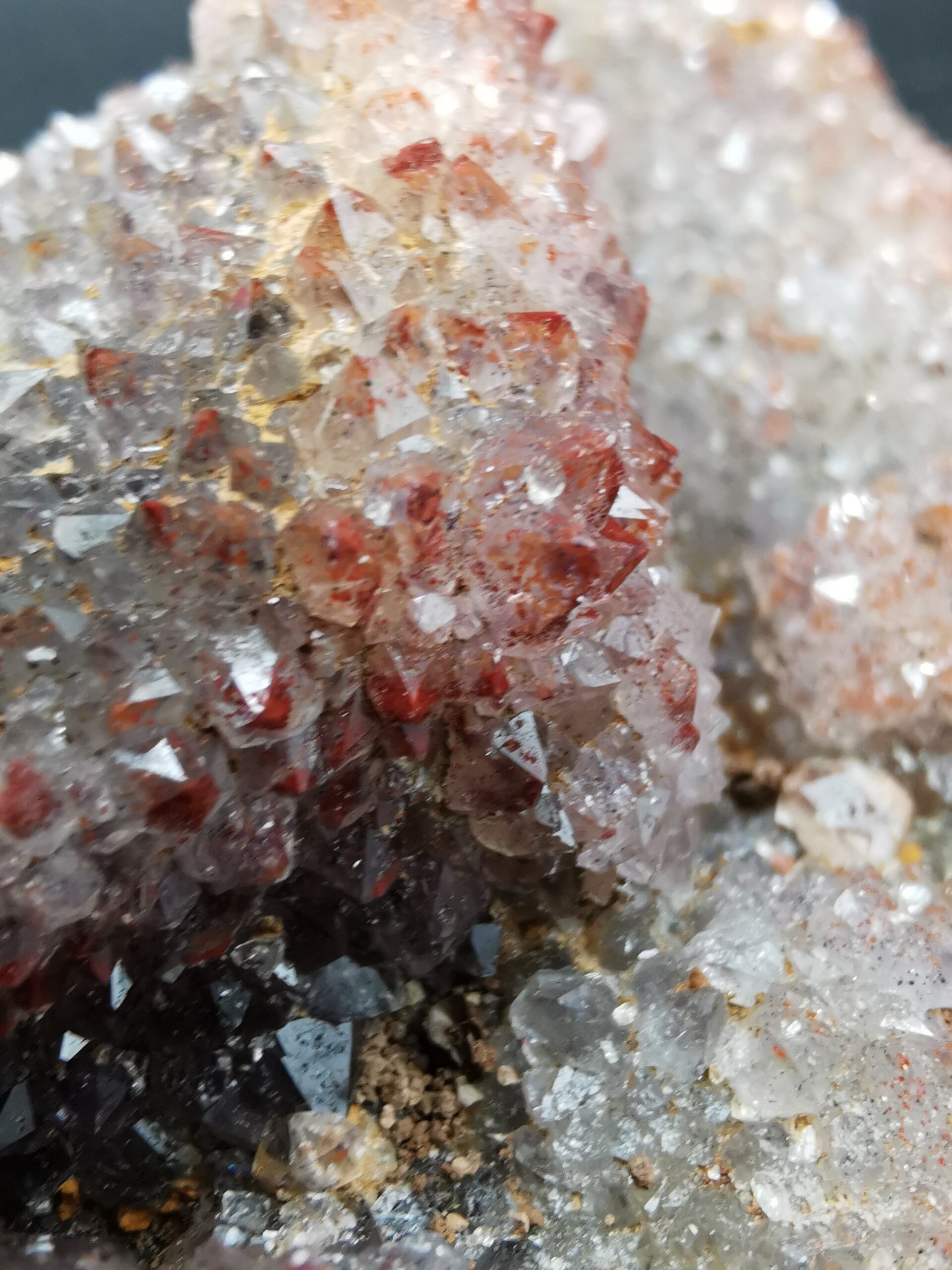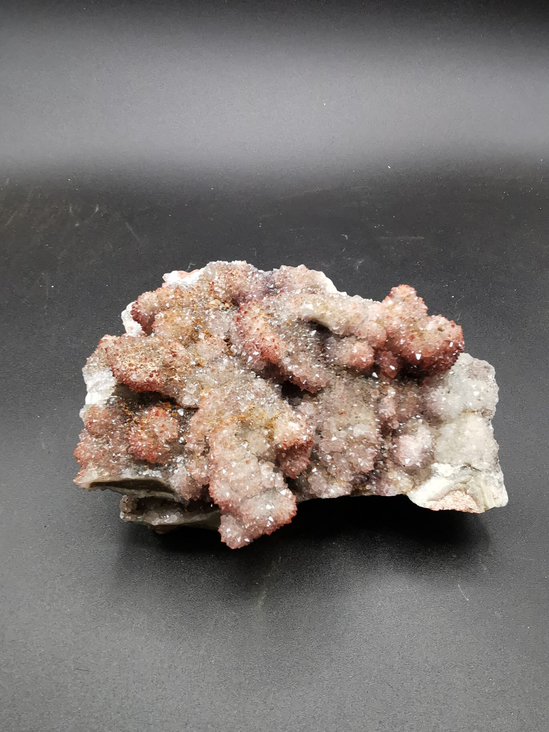The amethyst deposits of the Thunder Bay District are associated with the rocks of the Osler Group, formed during a late Precambrian stage of volcanism and faulting, from 1.2 to 0.9 billion years ago. In general, the amethyst deposits are in or near the granitic rocks, in proximity to the contacts between the rocks of the Osler and Sibley Groups. The faulting and related fracturing of these rocks during the late precambrian allowed for the intrusion of the fluids which ultimately led to the deposition of the amethyst crystals. These fluids precipitated the amethyst onto the walls of the fractures, creating crystal-lined veins and cavities. The faulting and fracturing – and therefore the nature and occurrence of ameythst-bearing veins – differs somewhat from locality to locality within the Thunder Bay District. Some brecciated zones are characterized by large numbers of relatively parallel small veinlets, while in other places much larger fractures are hosted by much more competent rock. (from https://www.davidkjoyceminerals.com/pagefiles/articles_thunderbayamethyst.asp)