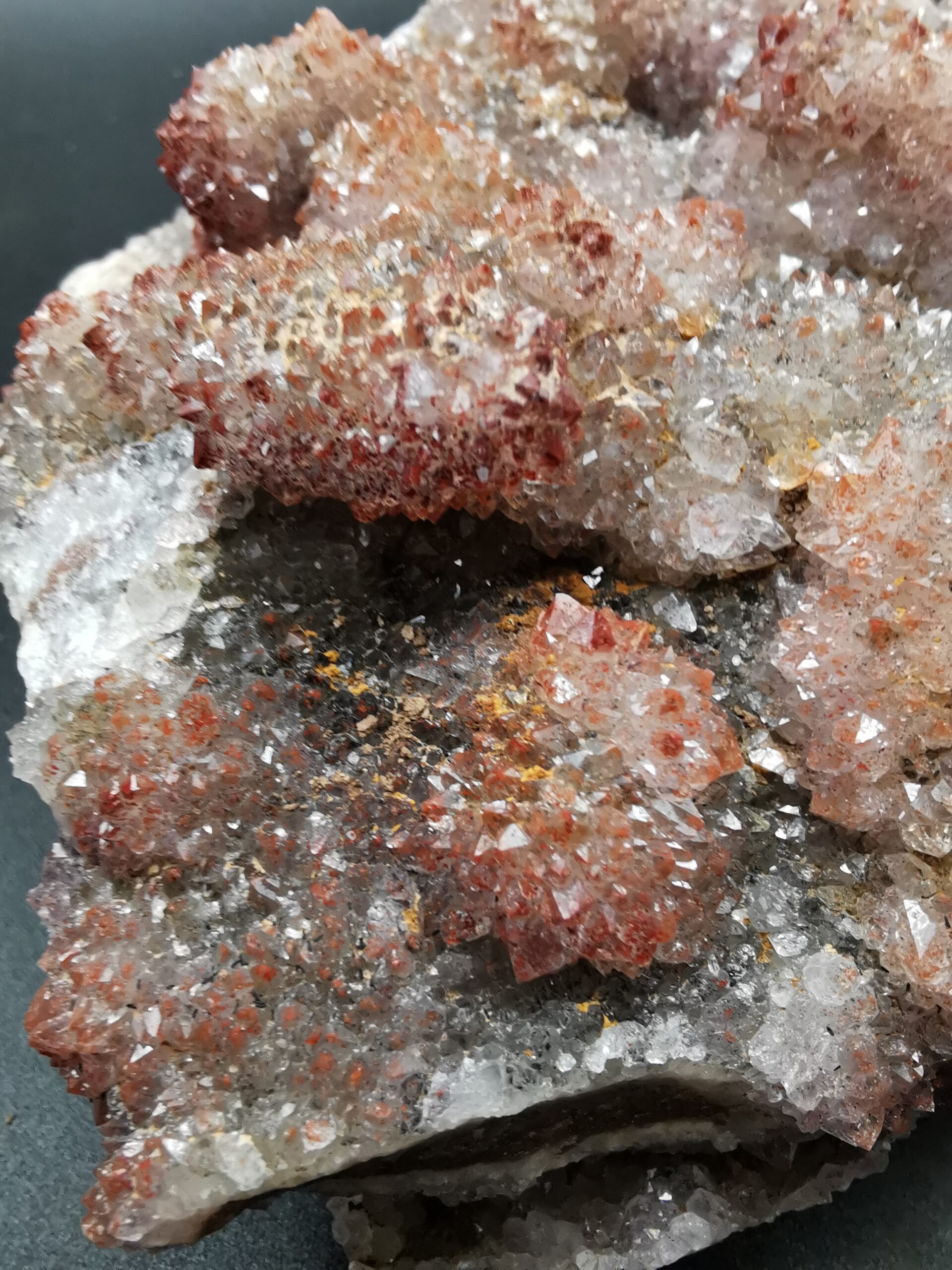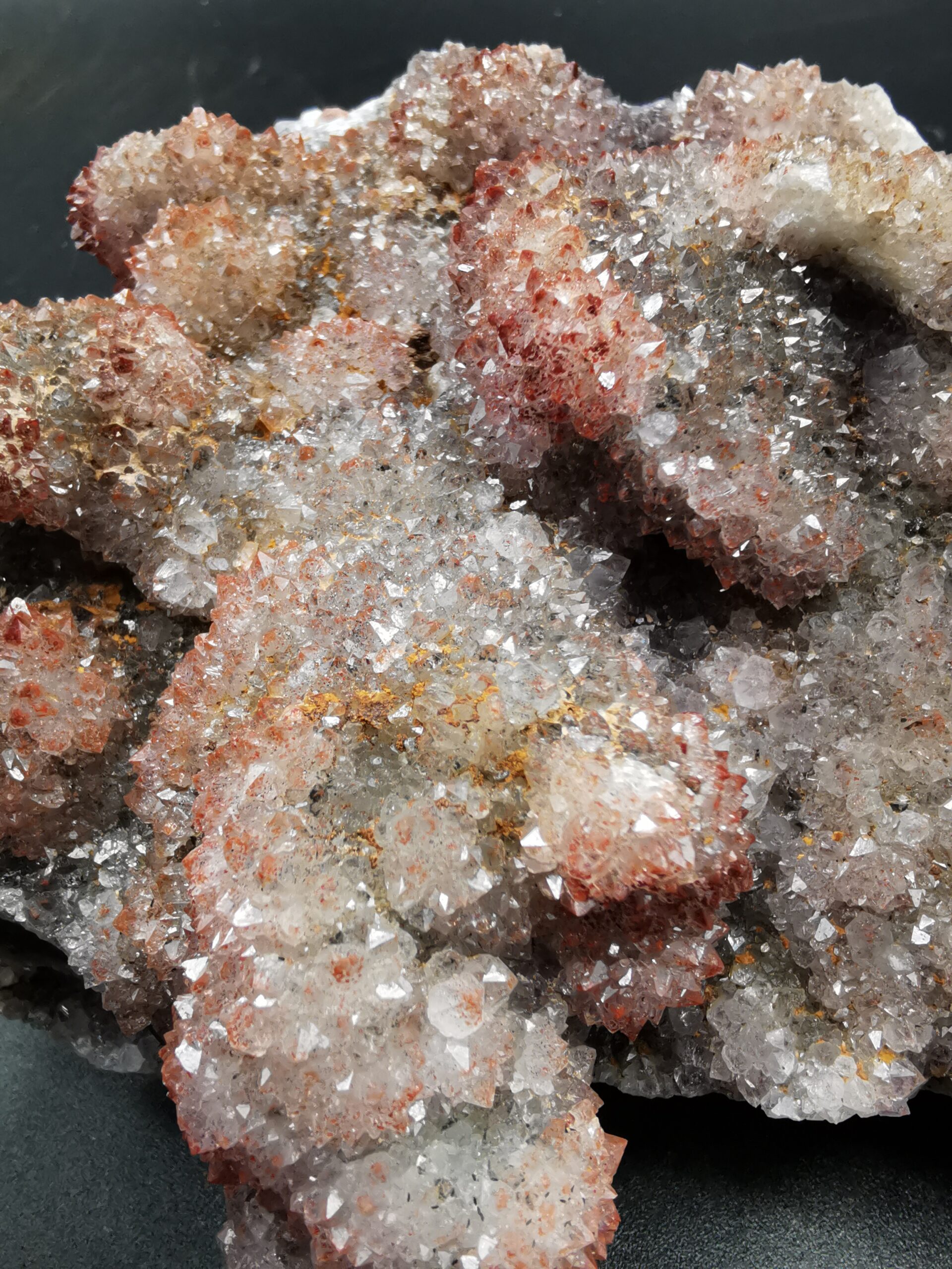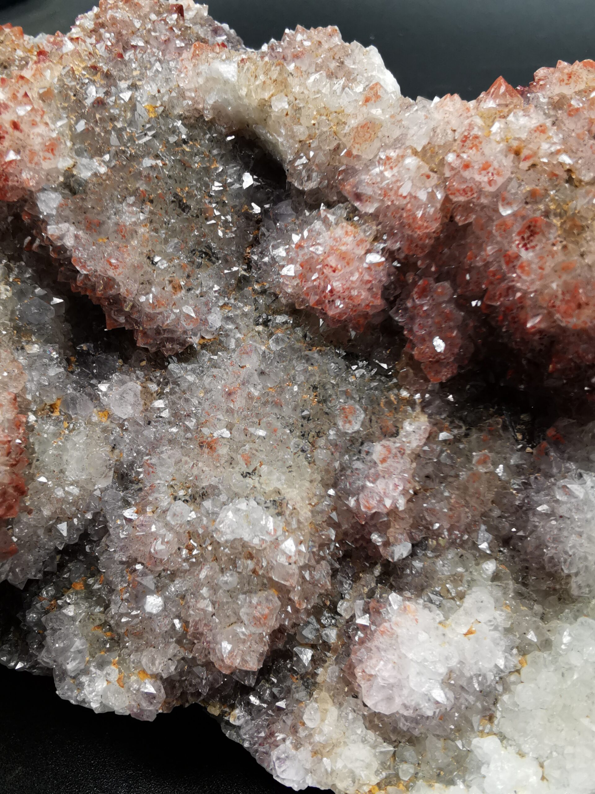 The amethyst deposits of the Thunder Bay District are associated with the rocks of the Osler Group, formed during a late Precambrian stage of volcanism and faulting, from 1.2 to 0.9 billion years ago. In general, the amethyst deposits are in or near the granitic rocks, in proximity to the contacts between the rocks of the Osler and Sibley Groups. The faulting and related fracturing of these rocks during the late precambrian allowed for the intrusion of the fluids which ultimately led to the deposition of the amethyst crystals. These fluids precipitated the amethyst onto the walls of the fractures, creating crystal-lined veins and cavities. The faulting and fracturing – and therefore the nature and occurrence of ameythst-bearing veins – differs somewhat from locality to locality within the Thunder Bay District. Some brecciated zones are characterized by large numbers of relatively parallel small veinlets, while in other places much larger fractures are hosted by much more competent rock. (from https://www.davidkjoyceminerals.com/pagefiles/articles_thunderbayamethyst.asp)
