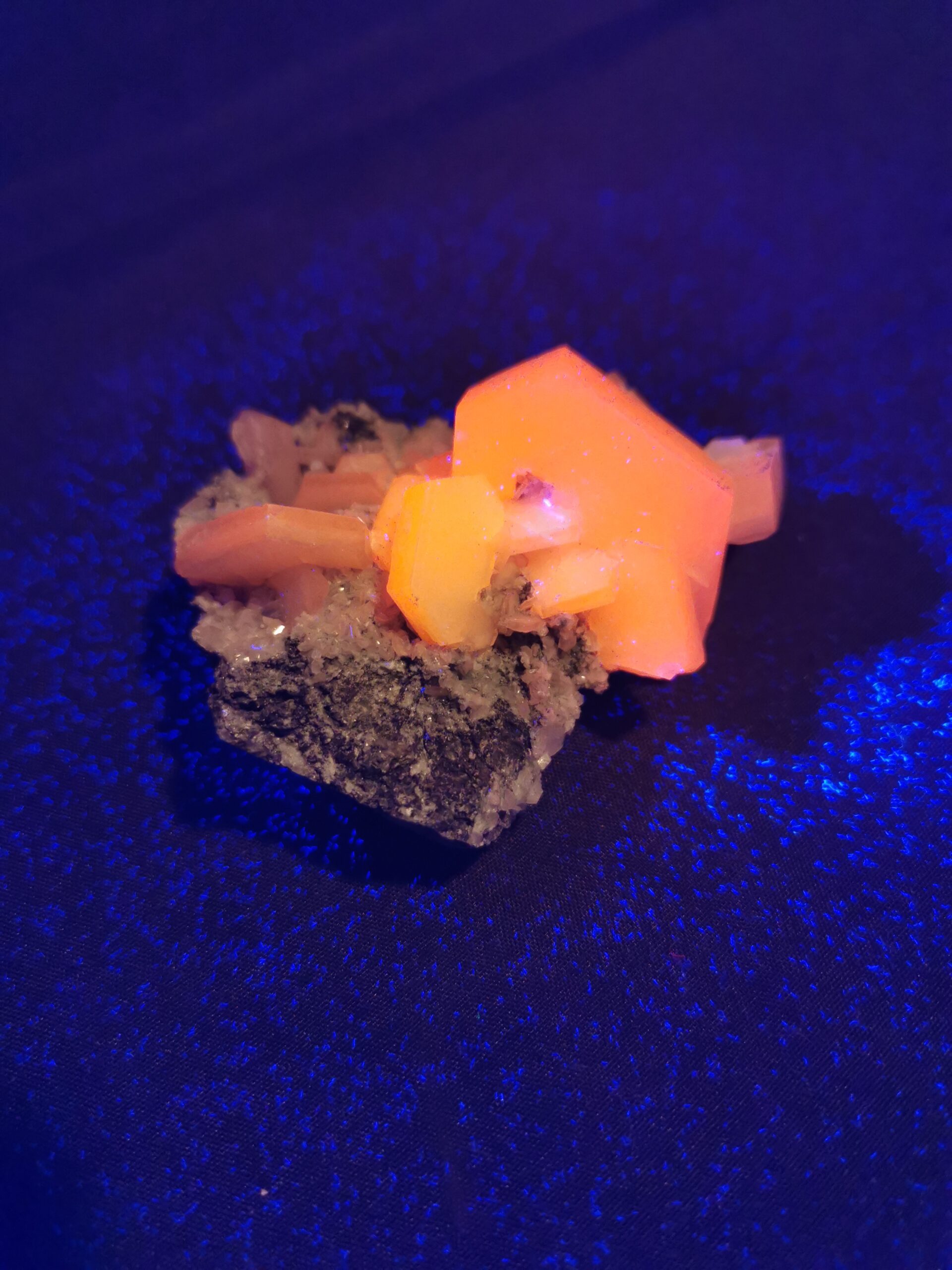 Highly UV reactive. These are one of the brightest minerals under UV that I have personally seen. Shows brilliant orange under long wave UV lighting.  It was very difficult to capture the true color under UV with my camera but I tried to get a representative photo and they are very beautiful.